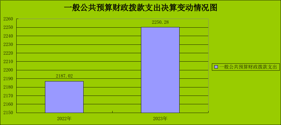 2023年度一般公共预算财政拨款支出2250.28万元,占本年支出合计的98.99%。与2022年度相比,一般公共预算财政拨款支出增加63.26万元,增长2.89%。主要变动原因是单位人员经费增加,一般公共预算财政拨款支出增加。