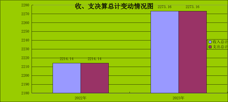 2023年度收、支总计均为2273.16万元。与2022年相比,收入总计增加59.02万元,增长2.67%。主要变动原因是单位人员经费增加,收入增加。与2022年相比,支出总计增加59.02万元,增长2.67%。主要变动原因是单位人员经费增加,支出增加。