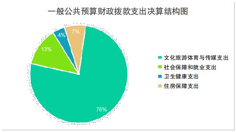 2023年度一般公共预算财政拨款支出107.66万元,主要用于以下方面:文化旅游体育与传媒支出82.05万元,占76.22%;社会保障和就业支出13.69万元,占12.72%;卫生健康支出4.39万元,占4.08%;住房保障支出7.53万元,占6.99%。