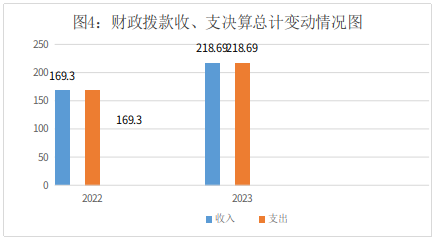 2023年度财政拨款收、支总计均为218.69万元。与2022年度相比,财政拨款收、支总计各增加49.39万元,增长29.17%。主要变动原因是项目经费和人员经费增加。