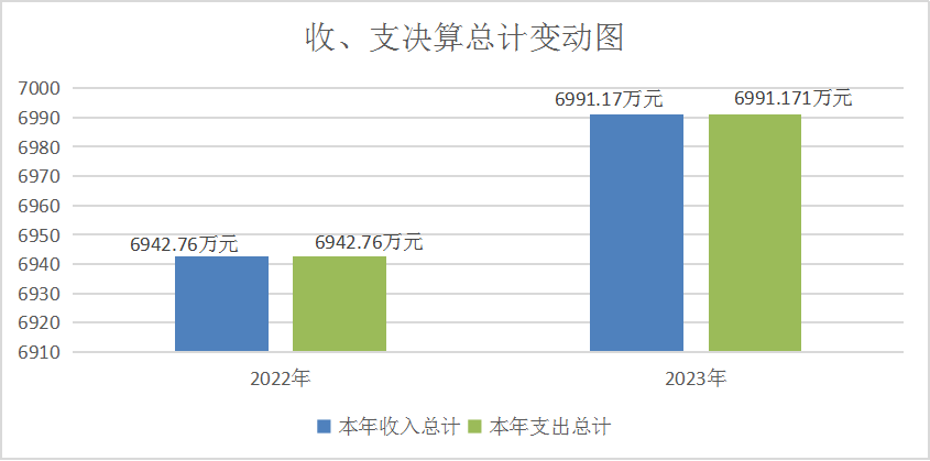 2023年度收、支总计均为6991.17万元。与2022年度相比,收、支总计各增加48.41万元,增长0.7%。主要变动原因是项目支出年初预算增加。