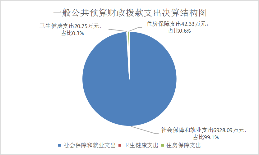 2023年度一般公共预算财政拨款支出6991.17万元,主要用于以下方面:社会保障和就业支出6928.09万元,占99.1%;卫生健康支出20.75万元,占0.3%;住房保障支出42.33万元,占0.6%。