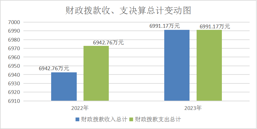 2023年度财政拨款收、支总计均为6991.17万元。与2022年度相比,财政拨款收、支总计各增加48.41万元,增长0.7%。主要变动原因是项目支出年初预算增加。