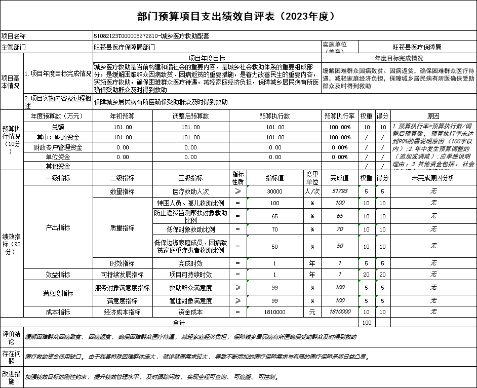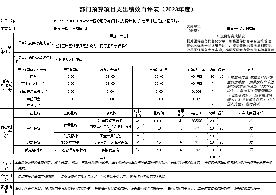 (一)评价得分:经过绩效评价,我县医疗保障与服务能力提升专项资金得分为100分。