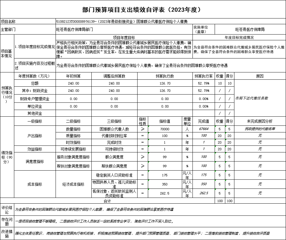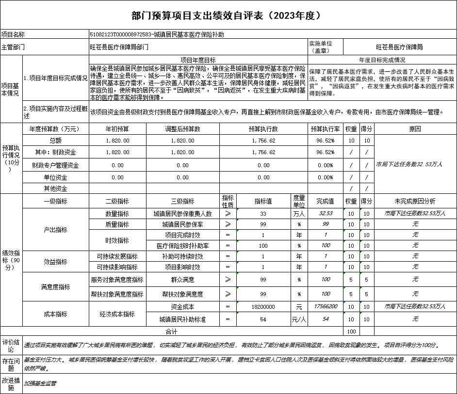 项目预算1820万元,项目支出1756.62万元,按政策全额用于城乡居民医疗保险保费补贴。制度齐全,资金管理规范,项目当年实施到位。通过项目实施有效缓解了广大城乡居民病有所医的难题,切实减轻了城乡居民的经济负担,有效防止了部分城乡居民因病返贫、因病致贫现象的发生。项目自评得分为100分。