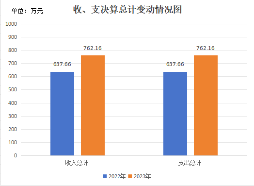 2023年度收、支总计762.16万元。与2022年度相比,收、支总计增加124.5万元,增长19.5%。主要变动原因是退休人员慰问金增加。