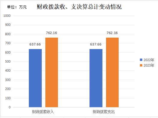 2023年度财政拨款收、支总计均为762.16万元。与2022年度相比,财政拨款收、支总计各增加124.5万元,增长19.52%。主要变动原因是退休人员慰问金增加。