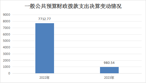 2023年度一般公共预算财政拨款支出980.54万元,占本年支出合计的9.26%。与2022年度相比,一般公共预算财政拨款支出减少6432.23万元,下降86.77%。主要变动原因是2023年项目资金主要为政府性基金预算财政拨款支出,一般公共预算财政拨款支出大幅减少。