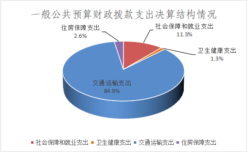 2023年度一般公共预算财政拨款支出5608.43万元,主要用于以下方面:社会保障和就业支出631.28万元,占11.3%;卫生健康支出70.42万元,占1.3%;交通运输支出4763.53万元,占84.9%;住房保障支出143.2万元,占2.6%。