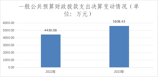 2023年度一般公共预算财政拨款支出5608.43万元,占本年支出合计的93.8%。与2022年度相比,一般公共预算财政拨款支出增加1178.35万元,增长26.6%。主要变动原因是2023年工程项目增加。
