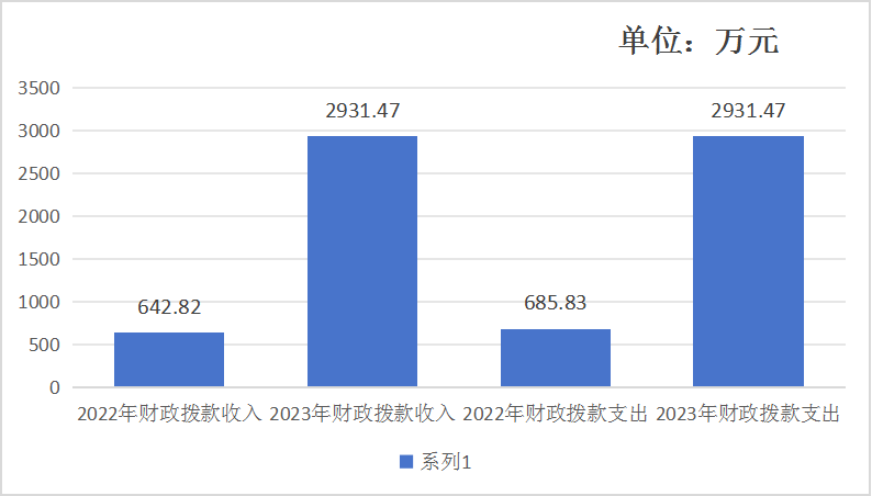 2023年度财政拨款收、支总计均为2931.47万元。与2022年度相比,财政拨款收入增加2288.65万元,增长356.03%;财政拨款支出总计增加2245.64万元,增长327.43%。主要变动原因是我单位在2023年项目资金增加,导致2023年收支总数增加。