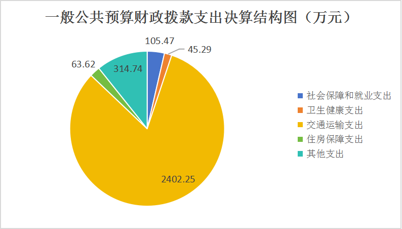 2023年度社会保障和就业支出105.47万元,占3.60%;卫生健康支出45.29万元,占1.55%;交通运输支出2402.25万元,占81.95%,住房保障支出63.62万元,占2.17%;其他支出314.74万元,占10.74%。