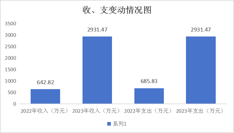 2023年度收、支总计均为2931.47万元。与2022年度相比,收入总计增加2288.65万元,增长356.03%;支出总计增加2245.64万元,增长327.43%。主要变动原因是我单位在2023年项目资金增加,导致2023年收支总数增加。