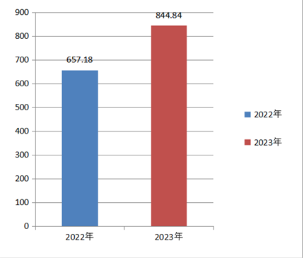 2023年度收、支总计均为844.84万元。与2022年度657.18万元相比,收、支总计均增加187.66万元,增长28.56%,主要变动原因是人员变动和项目增加。