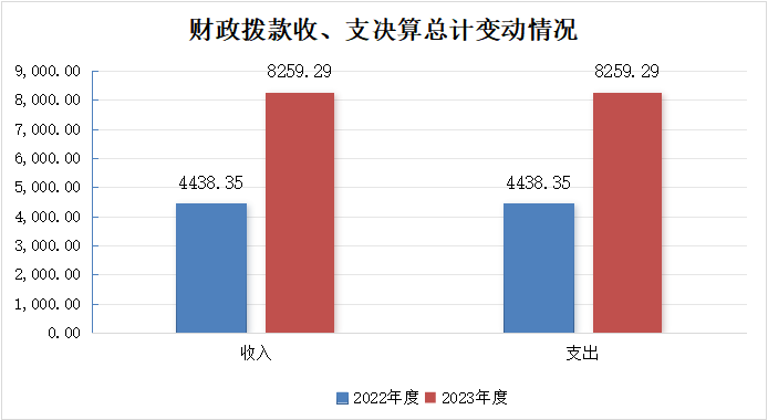 2023年度财政拨款收、支总计均为8259.29万元。与2022年度相比,财政拨款收、支总计各增加3820.94万元,增长86.09%。主要变动原因是项目支出增加。