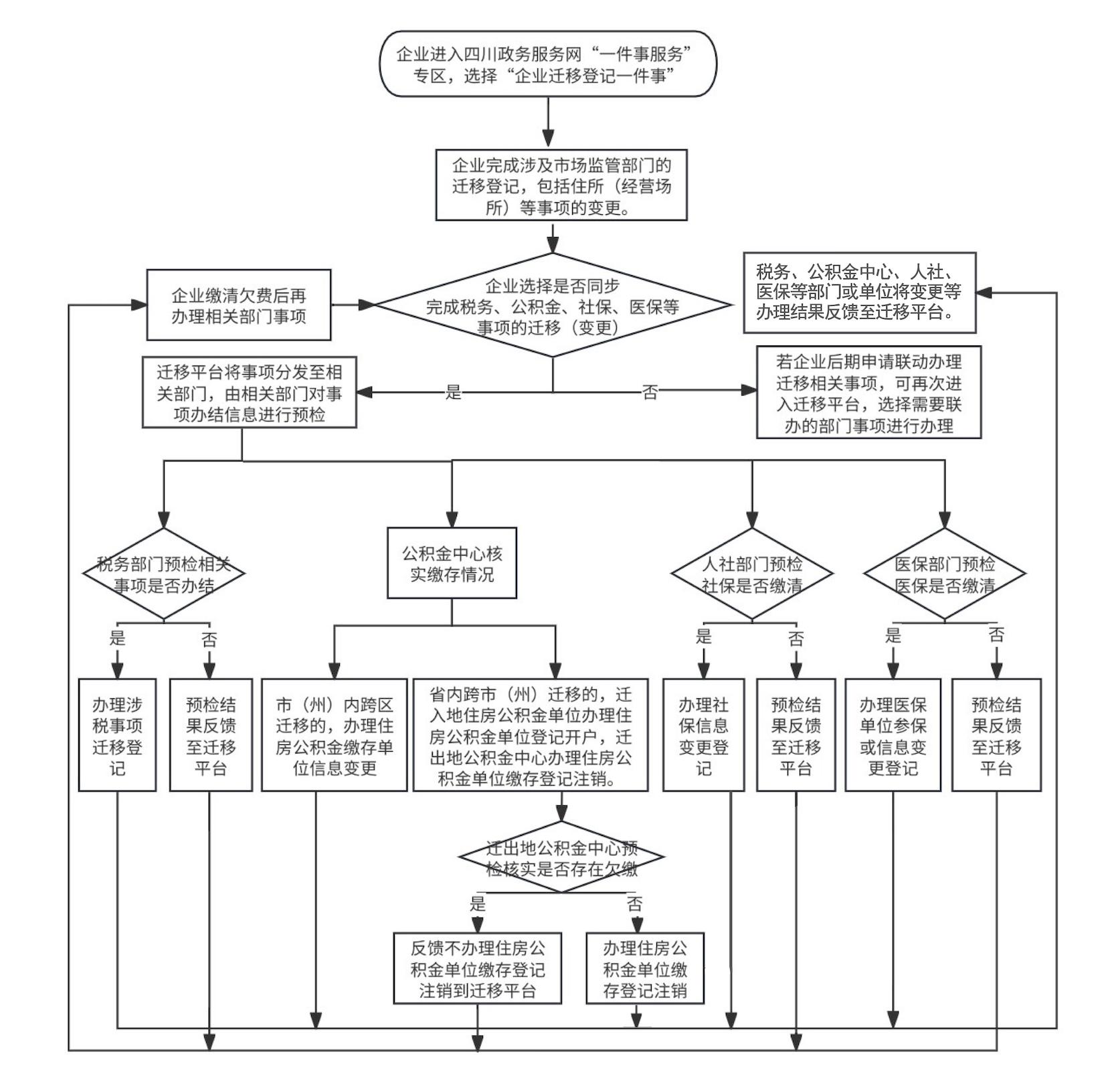 因经营主体住所(经营场所)发生变化的;因经营主体类型发生变化(如有限公司变更为股份公司、内资公司变更为外资公司登记等),超越原登记机关地域管辖范围或级别管辖权限的;或因其他原因需办理迁移的企业,通过迁移平台提交一次申请材料,即可完成企业迁移登记、税务、公积金、社保、医保相关事 项变更。