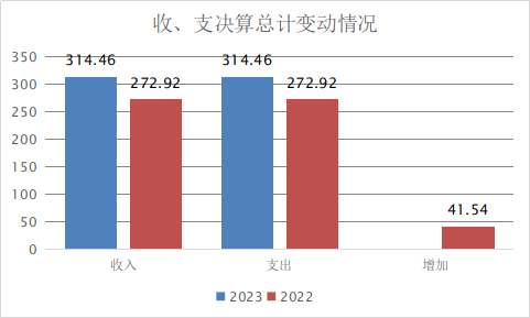 2023年度收、支总计314.46万元。与2022年相比,收、支总计各增加41.54万元,增长15.22%。主要变动原因是人员及老干部经费增加。