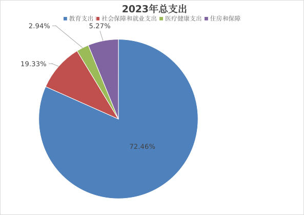 2023年度一般公共预算财政拨款支出896.96万元,主要用于以下方面:一般公共服务支出0万元;教育支出649.95万元,占74.36%;科学技术支出0万元;文化旅游体育与传媒支出0万元;社会保障和就业支出173.38万元,占19.33%;卫生健康支出26.36万元,占2.94%;住房保障支出47.27万元,占5.27%。
