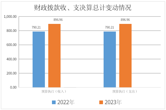 2023年度财政拨款收、支总计均为896.96万元。与2022年度相比,财政拨款收入增加106.75万元,增长13.51%;财政拨款支出增加106.75万元,增长13.51%。主要变动原因是2023年人员经费、公共经费、项目经费增加。