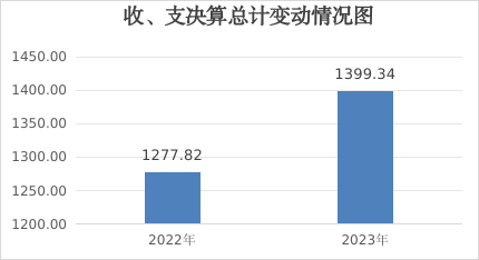 2023年度收、支总计均为1399.34万元。与2022年度相比,收、支总计各增加121.52万元,增长0.09%。主要变动原因是人员经费标准提升经费增加。