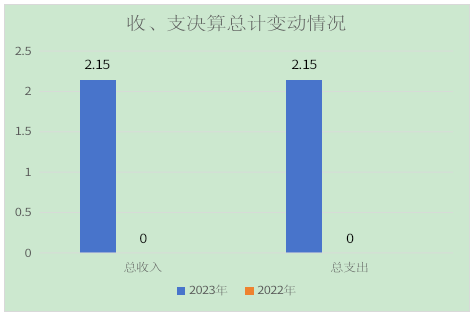 2023年度收、支总计均为2.15万元。与2022年度相比,收、支总计各增加2.15万元,增加100%。主要变动原因是本年新增单位。