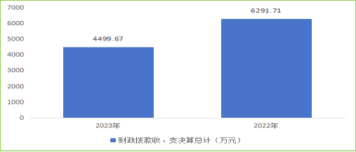 2023年度财政拨款收、支总计均为4,499.67万元。与2022年度相比,财政拨款收、支总计各减少1,792.04万元,下降28.48%。主要变动原因是:2023年收、支较2022年减少了专项债券资金(四川省旺苍职业中学产教融合实训培训基地建设项目)2,196.63万元,根本原因在于本级财政资金支付紧张所致。