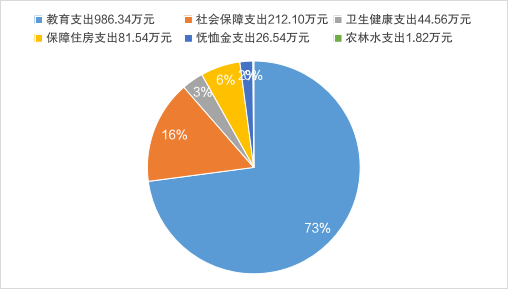 2023年一般公共预算财政拨款支出1352.9万元,主要用于以下方面:教育支出986.34万元,占72.9%;社会保障和就业支出212.10万元,占15.68%;卫生健康支出44.56万元,占3.29%;住房保障支出81.54万元,占6.03%;抚恤金支出26.54万元,占1.96%;农林水支出1.82万元,占0.13%。
