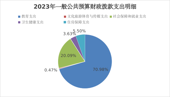 2023年一般公共预算财政拨款支出589.43万元,主要用于以下方面:教育支出418.35万元,占70.98%;文化旅游体育与传媒支出2.75万元,占0.47%,社会保障和就业支出118.4万元,占20.09%;卫生健康支出17.43万元,占2.96%;住房保障支出32.49万元,占5.5%。