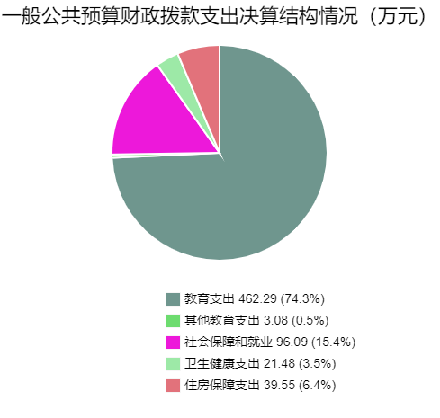 2023年一般公共预算财政拨款支出619.41万元,主要用于以下方面:一般公共服务支出0万元,占0%;教育支出462.29万元,占74.63%; 其他教育支出支出3.08万元,占0.5%;社会保障和就业支出96.09万元,占15.51%;卫生健康支出21.48万元,占3.47%;住房保障支出39.55万元,占6.39%。