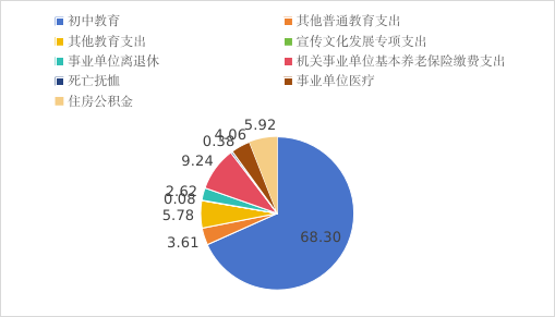 2023年一般公共预算财政拨款支出1675.78万元,主要用于以下方面:初中教育支出1200.31万元占68.3%,其他教育支出 101.52万元,占比5.78%;宣传文化发展专项支出 1.45 万元,占比0.08%;占比养老保险162.45万元,占9.24%;事业单位离退休46.09万元,占2.62%;死亡抚恤金支出6.7万元,占0.38%;卫生健康支出71.36万元,占4.06%;住房保障支出104.66万元,占5.92%。