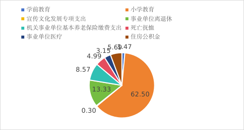 2023年一般公共预算财政拨款支出520.97万元,主要用于以下方面:学前教育支出7.68万元占1.47%;小学教育支出325.6占62.5%;养老保险44.63万元,占8.57%;事业单位离退休69.46万元,占13.33%;死亡抚恤金支出26万元,占4.99%;卫生健康支出16.43万元,占3.15%;住房保障支出29.62万元,占5.69%。宣传文化发展专项支出1.55万元,占0.03%。