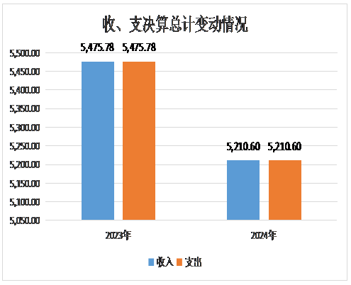 2024年度收、支总计均为5,210.60万元。与2023年度相比,收、支总计各减少265.18万元,下降4.84%。主要变动原因是减少退役军人人事档案室建设和双拥创建阶段性项目指标。