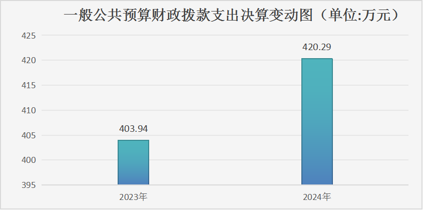 2024年一般公共预算财政拨款支出420.29万元,占本年支出合计的100%。与2023年相比,一般公共预算财政拨款支出增加16.35万元,增长4.05%。主要变动原因是新进人员增加,基本增加,收入增加。