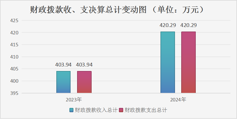2024年财政拨款收、支总计420.29万元。与2023年相比,财政拨款收、支总计各增加16.35万元,增长4.05%。主要变动原因是新进人员增加,基本增加,收入增加。