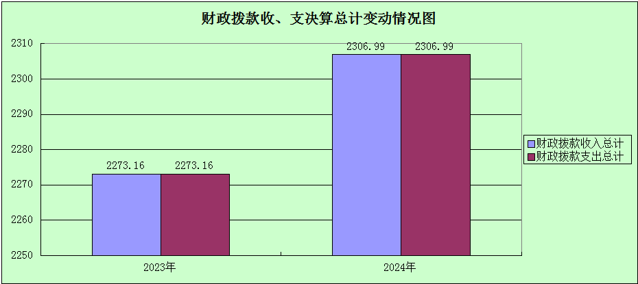 2024年度财政拨款收、支总计均为2306.99万元。与2023年相比,收入总计增加33.83万元,增长1.49%。主要变动原因是项目经费增加。与2023年相比,支出总计增加33.83万元,增长1.49%。主要变动原因是项目经费增加。
