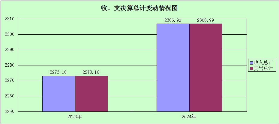 2024年度收、支总计均为2306.99万元。与2023年度相比,与2023年相比,收入总计增加33.83万元,增长1.49%。主要变动原因是项目经费增加,收入增加。与2023年相比,支出总计增加33.83万元,增长1.49%。主要变动原因是项目经费增加,支出增加。