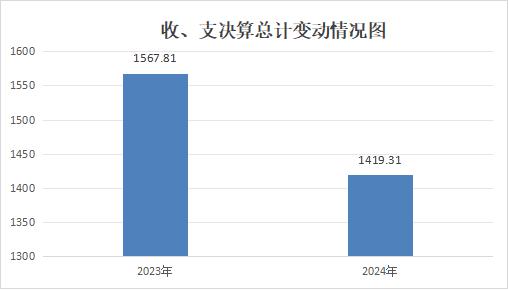 2024年度收、支总计均为1419.31万元。与2023年度相比,收、支总计各减少148.50万元,下降9.5%。主要变动原因是2024年度人员减少引起的工资福利支出、商品服务支出减少。