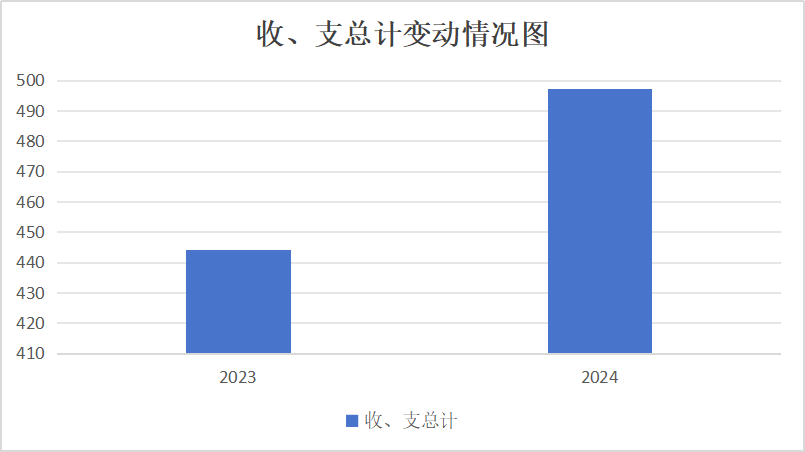 2024年度收、支总计均为497.2万元。与2023年度444.1万元相比,收、支总计各增加53.1万元,上升11.95%。主要变动原因是预算项目增加。