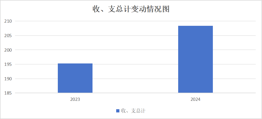 2024年度收、支总计均为208.33万元。与2023年度195.28万元相比,收、支总计各增加13.05万元,上升6.68%。主要变动原因是预算项目增加。