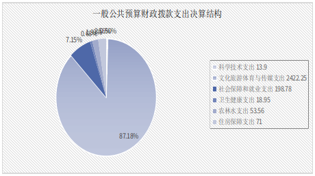 2024年度一般公共预算财政拨款支出2778.44万元,主要用于以下方面:科学技术支出13.9万元,占0.5%;文化旅游体育与传媒支出2422.25万元,占87.18%;社会保障和就业支出198.78万元,占7.15%;卫生健康支出18.95万元,占0.68%;农林水支出53.56万元,占1.93%;住房保障支出71万元,占2.56%。