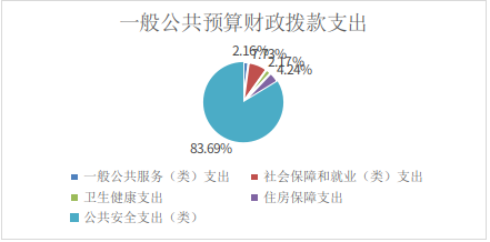 2024年度一般公共预算财政拨款支出9477.25万元,主要用于以下方面:一般公共服务支出(类)支出205万元,占2.16%;公共安全支出(类)支出7931.11万元,占83.69%;社会保障和就业(类)支出733.03万元,占7.73%;卫生健康支出206.02万元,占2.17%;住房保障支出402.10万元,占4.24%。