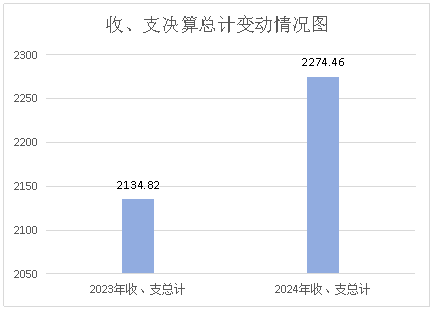 2024年度收、支总计均为2274.45万元。与2023年度相比,收、支总计各增加139.63万元,增长6.54%。主要变动原因是村级公共服务经费调整,增加国有企业退休人员社会化管理补助支出、其他国有土地使用权出让收入安排的支出。