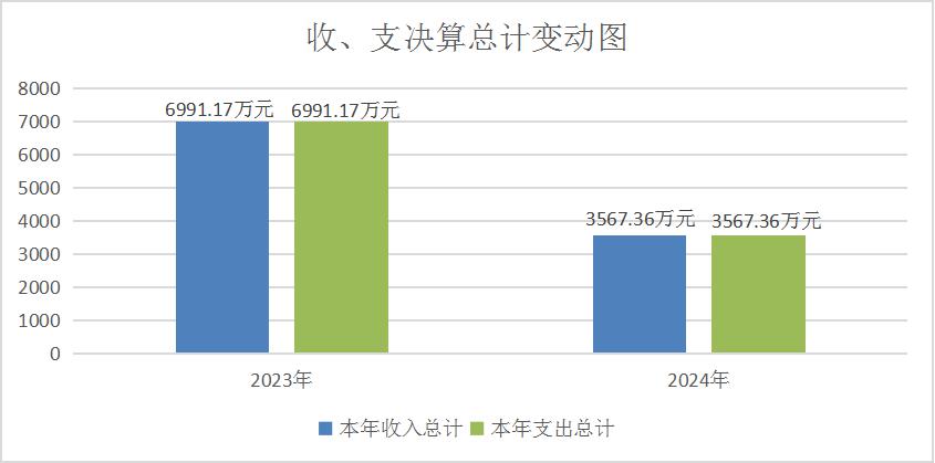 2024年度收、支总计均为3567.36万元。与2023年度相比,收、支总计各减少3423.81万元,下降48.97%。主要变动原因是本年度机关事业单位职业年金缴费收、支均减少,以及本年度无行政单位离退休支出。