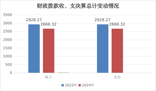 2024年度财政拨款收入、支出总计均为2666.32万元。与2023年度相比,财政拨款收入总计、支出总计各减少261.95万元,下降8.95%。主要变动原因是学校基建项目减少、教师人数减少、学校厉行节约。
