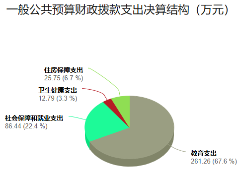 2024年度一般公共预算财政拨款支出386.24万元,主要用于以下方面:教育支出261.26万元,占67.6%;社会保障和就业支出86.44万元,占22.4%;卫生健康支出12.79万元,占3.3%;住房保障支出25.75万元,占6.7%。