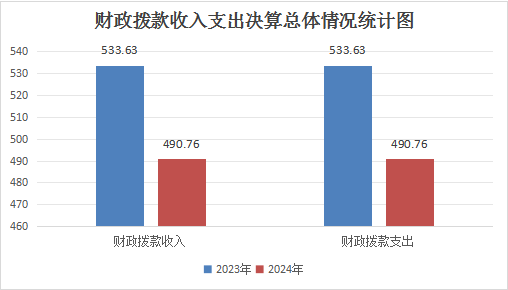 2024年度财政拨款收、支总计均为490.76万元。与2023年度财政拨款收支533.63万元相比,财政拨款减少42.87万元。主要变动原因是教师退休,基本支出正常减少。
