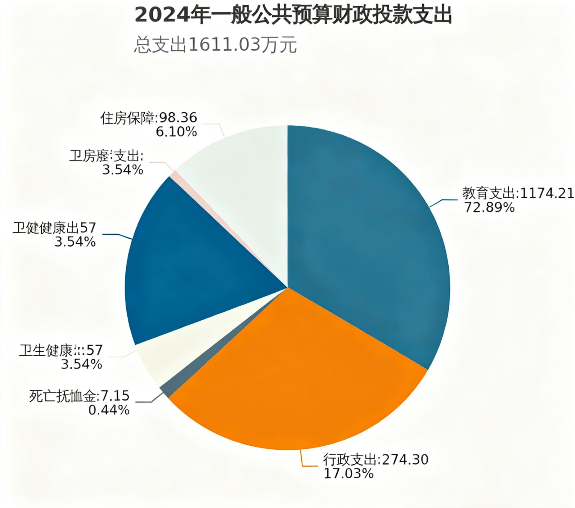 2024年一般公共预算财政拨款支出1611.03万元,主要用于以下方面:教育支出1174.21万元占72.89%,行政事业单位养老支出274.30万元,占17.03%;死亡抚恤金支出 7.15万元,占0.44%,卫生健康支出57万元,占3.54 %;住房保障支出98.36万元,占6.10%。