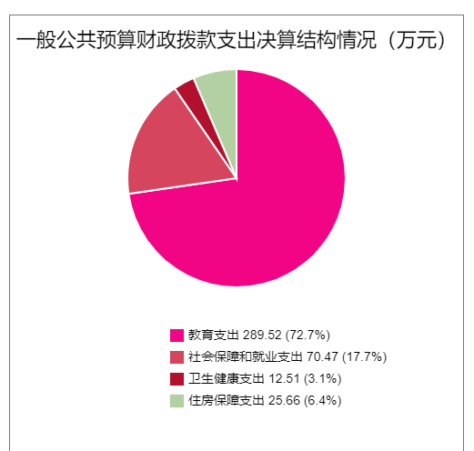 2024年一般公共预算财政拨款支出398.16万元,主要用于以下方面:教育支出289.52万元,占72.71%;社会保障和就业支出70.47万元,占17.70%;卫生健康支出12.51万元,占3.14%;住房保障支出25.66万元,占6.44%。