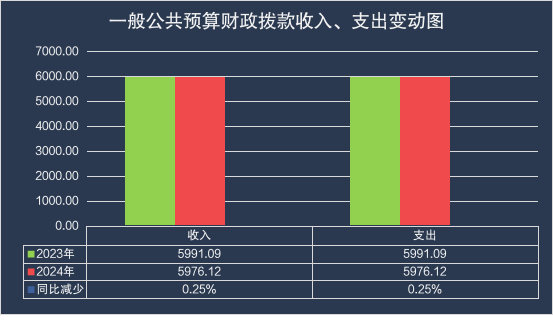 2024年一般公共预算财政拨款收入总计5976.12万元、支出总计5976.12万元。与2023年一般公共预算财政拨款收入、支出总计5991.09万元相比,一般公共预算财政拨款收入、支出减少14.97万元,减少0.25%。变动不大,属正常波动。