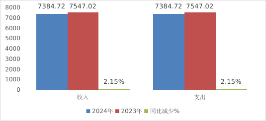 2024年度收入总计7384.72万元(含年初结转和结余499万元)、支出总计7384.72万元。与2023年7547.02万元相比,收入总计减少162.3万元,减少2.15%、支出总计减少162.3万元,减少2.15%。